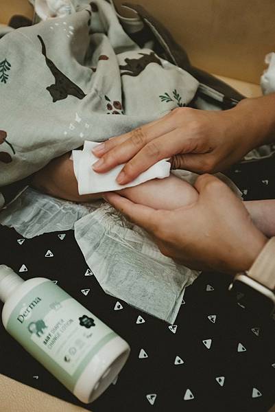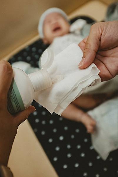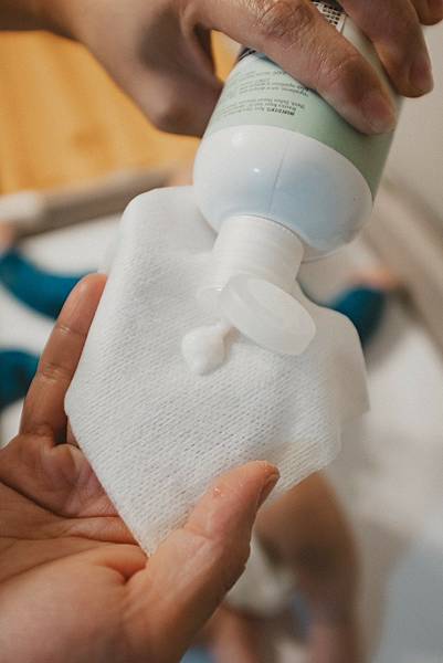 再將乾洗屁屁乳倒於乾溼巾上後擦拭屁屁