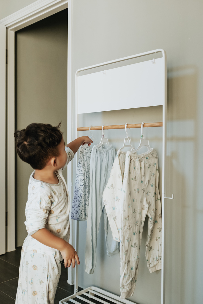 前開連身衣讓小雨的手可以完全伸直穿脫
