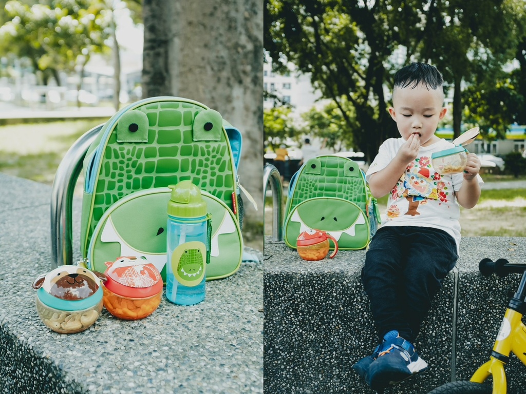 我們把零食盒跟水壺都放進外出包包裡