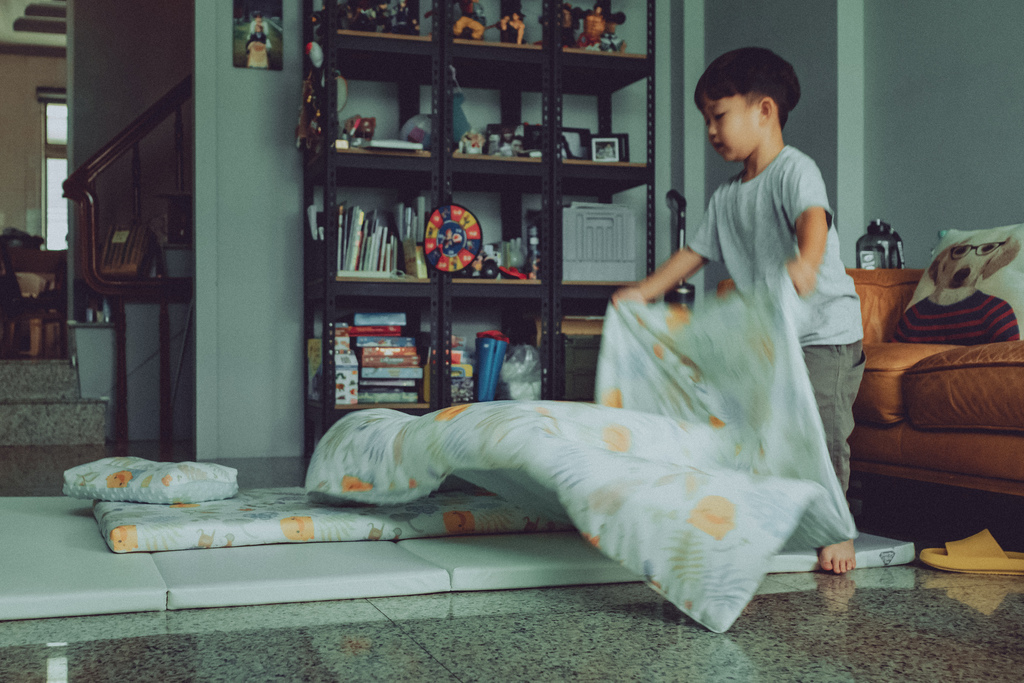 \ 平常不知道他在學校有沒有好好收棉被 /