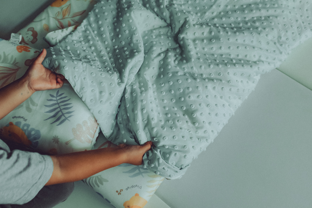湖水綠這一面是安撫被,逗逗一顆一顆可以讓小朋友摸著摸著就睡著