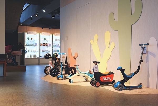 這邊有搖搖車、滑步車、蝸牛車、滑板車